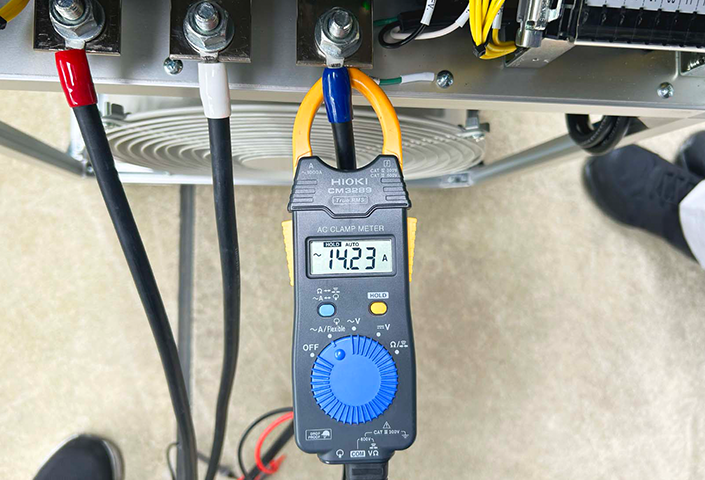 点検の結果、エンジンの稼働時間や各動作においてもすべて正常で、問題なく点検を完了しました。今回は特に、始動用バッテリーについて念入りに確認を行い、発電機本体の計器による測定に加え、クランプメーターを使用して直接電圧を測定することで、より正確な状態確認を実施しています。
